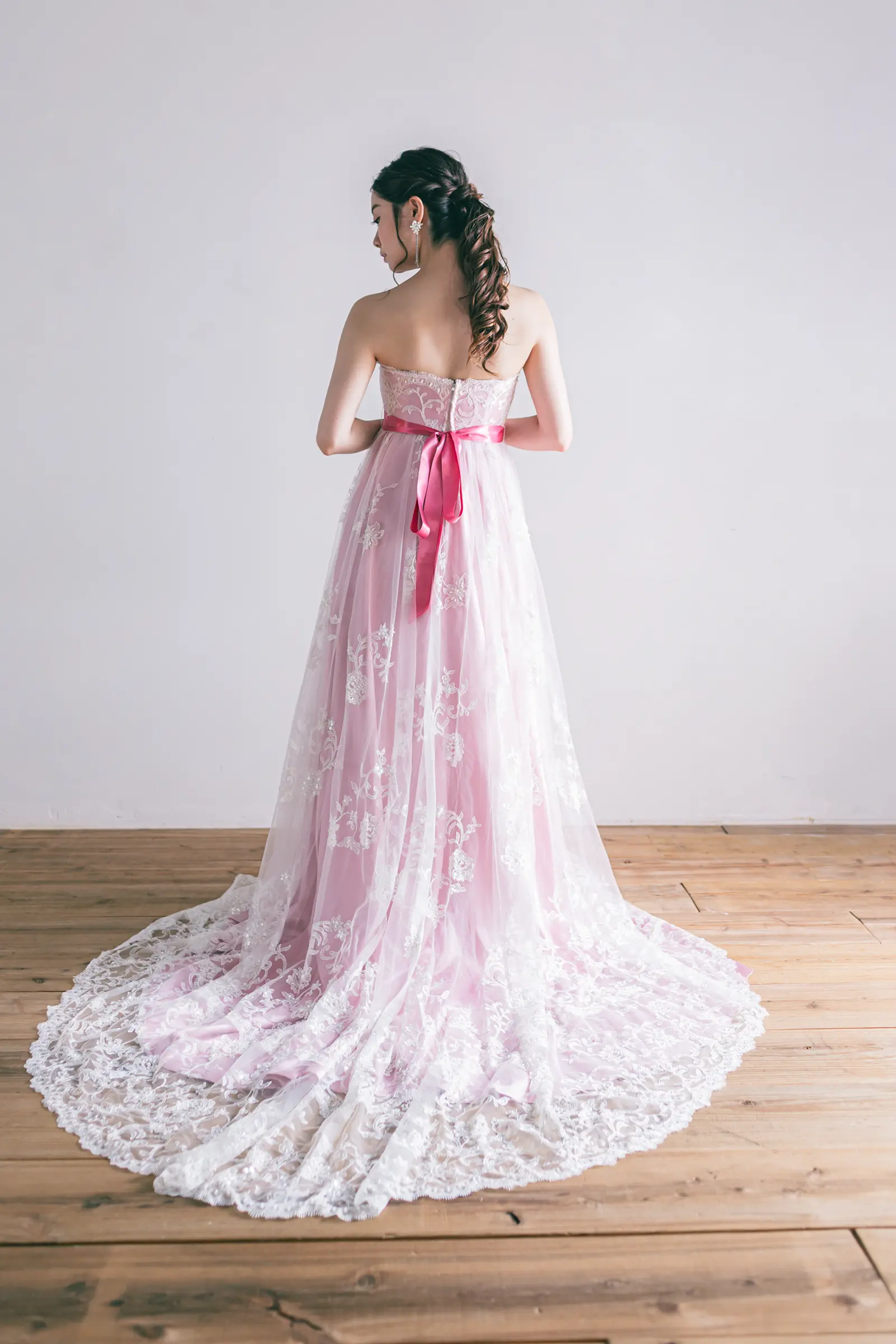 背中の仕様は、美しいボディラインを崩さないスッキリとしたファスナーを採用。7号サイズにジャストフィットし、甘さを抑えた「大人のピンク」を楽しみたい花嫁様にふさわしい、洗練された一着です。