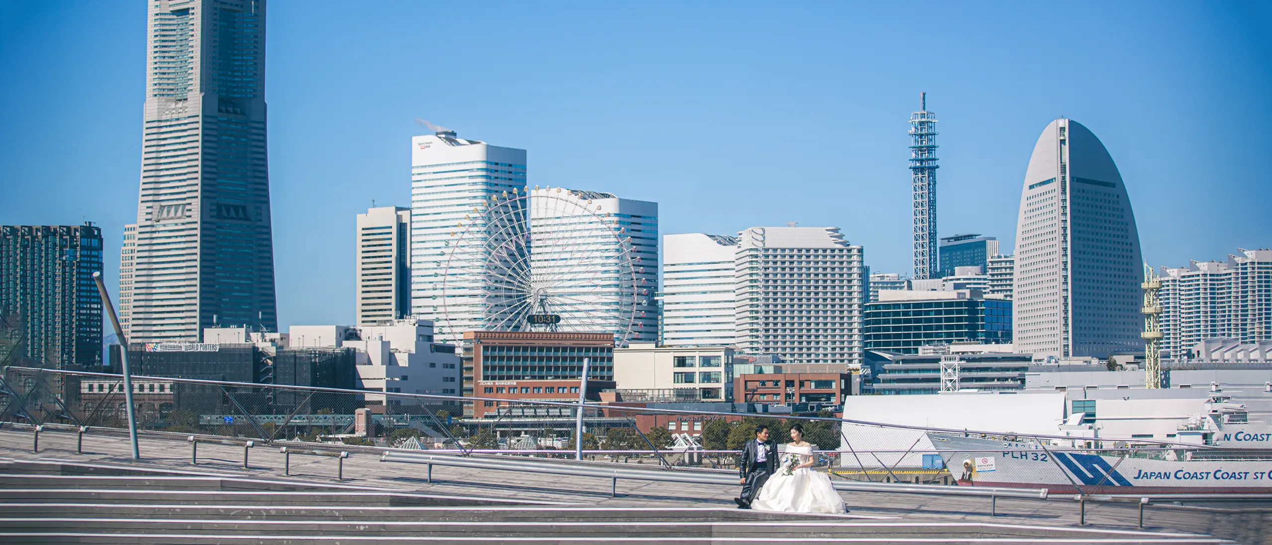 大さん橋、山下公園、三溪園など横浜らしいロケーション撮影から、 家族との会食を組み合わせたフォト会食、少人数の挙式+会食まで。 横浜で叶えられるウェディングスタイルを、わかりやすくご案内します。